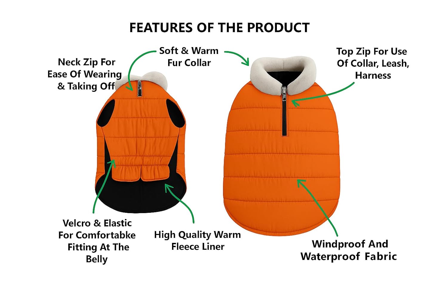 Flamboyant Design: Dog coats have a cute fur collar. This soft fur collar is comfortable and works well in protecting your pets neck from cold and chilly winds. The neck area of the jacket has a zip for the ease of wearing and take off. The belly area has adjustable velcro tapes that makes it super easy to wear and take off. The 2 way hemming zipper on the top makes it easier to put any collar, leash or harness without hassle. The stretched elastic band on the belly makes it really comfortable.