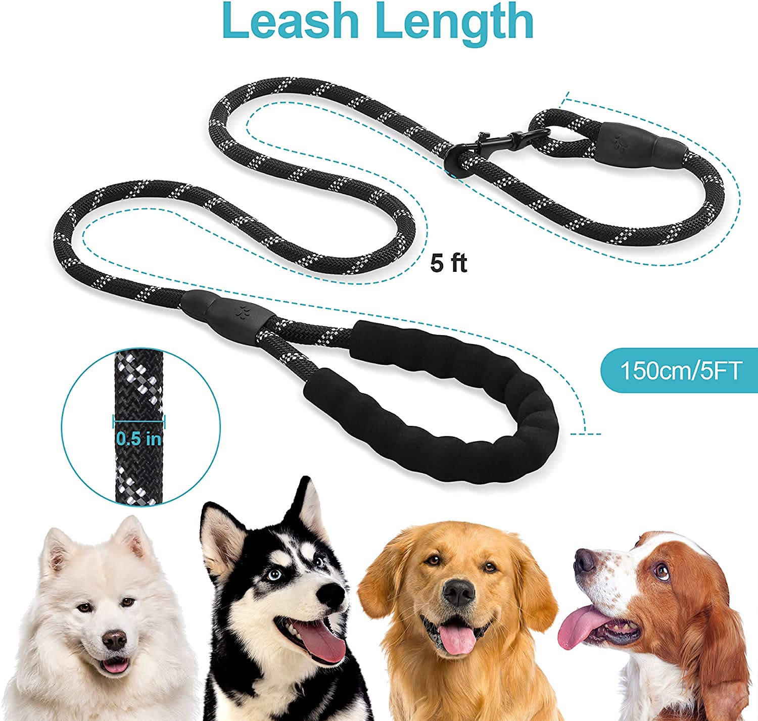 Dog Leash 5FT Long, ½ Inch Thick Reflective Heavy Duty Rope with Anti-Slip
